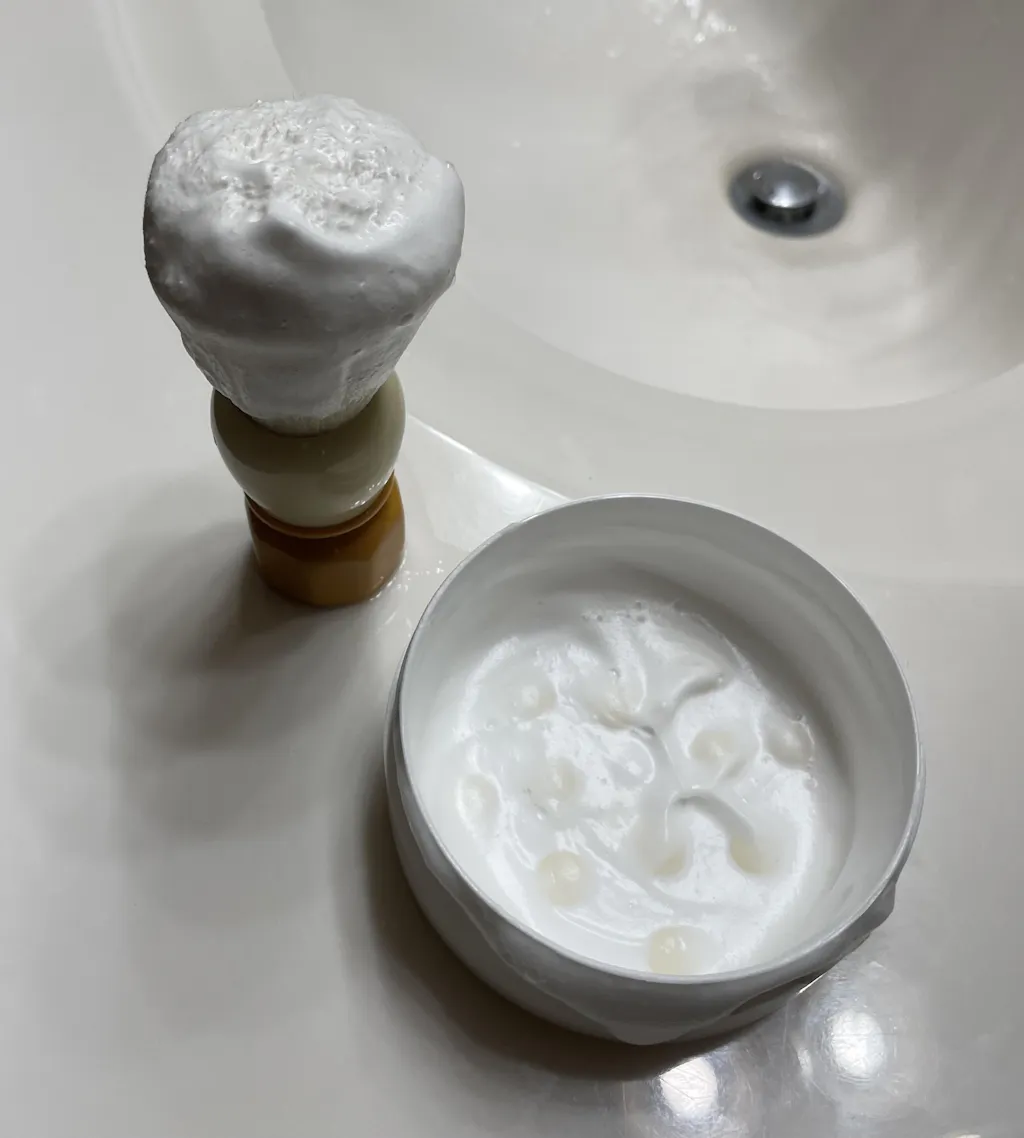 التعليمات: ضعه بسخاء على الوجه باستخدام فرشاة حلاقة مبللة واحلق. شطف بالماء الدافئ.